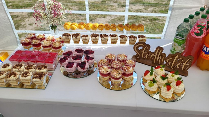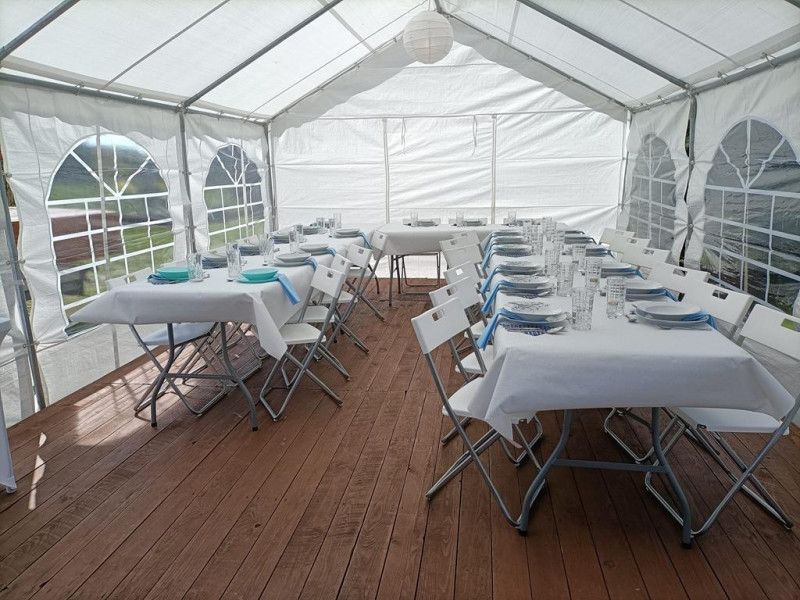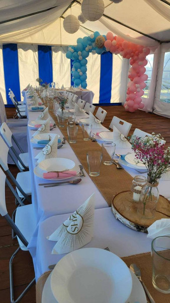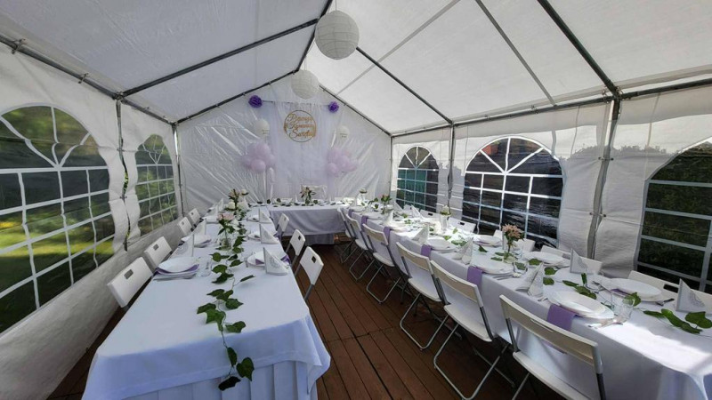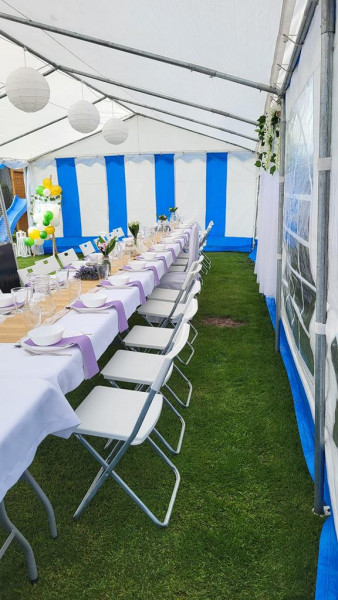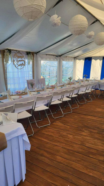 Posiadamy krzesła, stoły, zestawy biesiadne, podłogę, warniki do wody, zastawę stołową (komplet talerzy, sztućców oraz filiżanki), nagrzewnicę, oświetlenie oraz dekoracje.