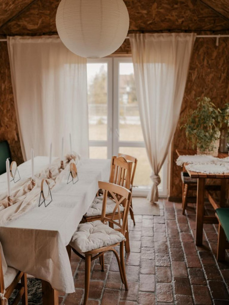 Naturalne wnętrza, cisza i otoczenie przyrody sprzyjają zarówno organizacji niewielkich przyjęć, jak i regeneracji w gronie najbliższych.