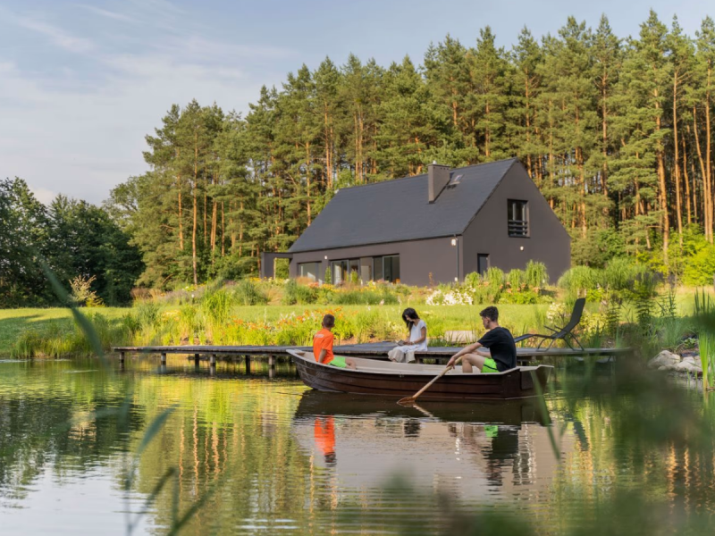 Co oferujemy? Ogród o powierzchni 1,5 hektara, zarybiony staw, taras nad wodą, mini plażę, łódkę …gdybyście chcieli odpłynąć na chwilę.