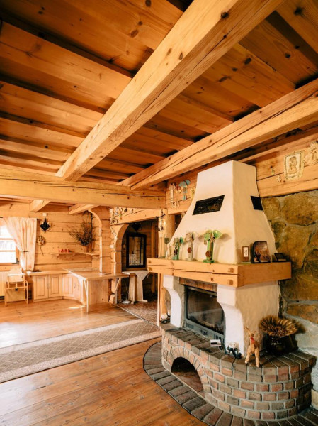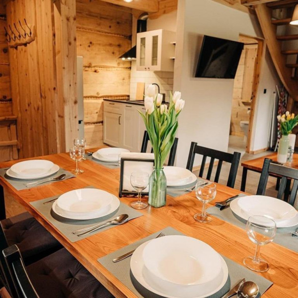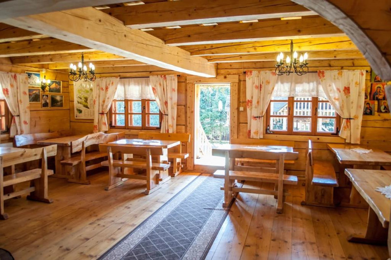 Klimatyczne wnętrza i autentyczny góralski styl — drewno, ciepła atmosfera, jadalnia z kominkiem, która stwarza rodzinny i uroczysty nastrój.