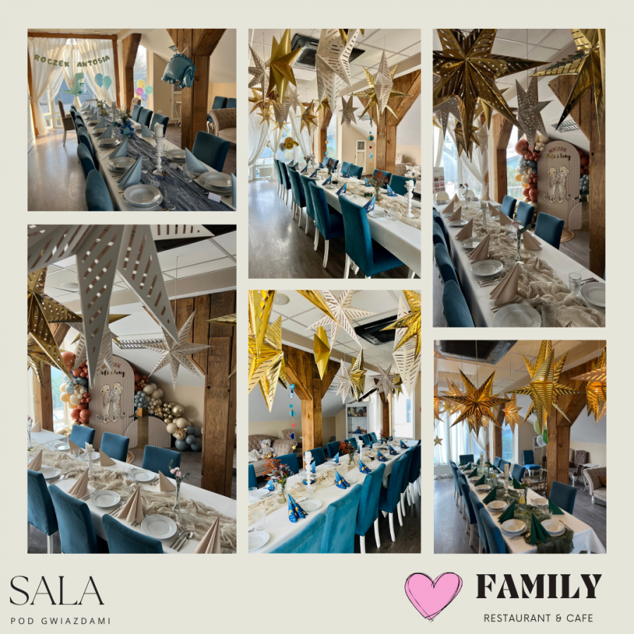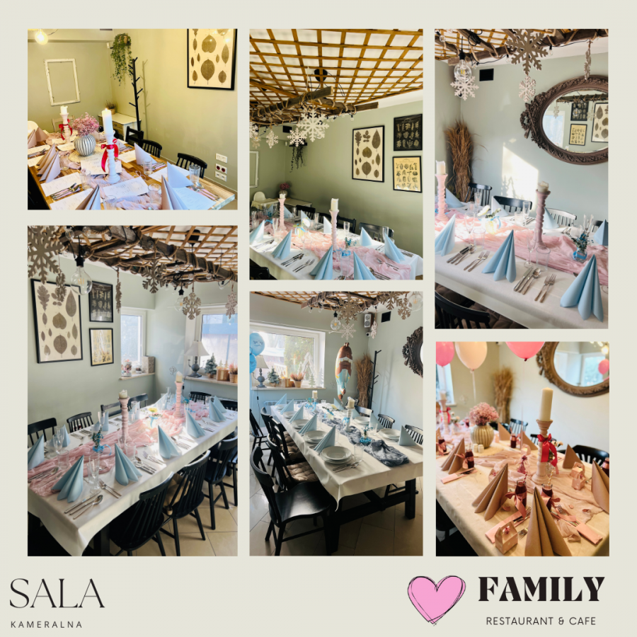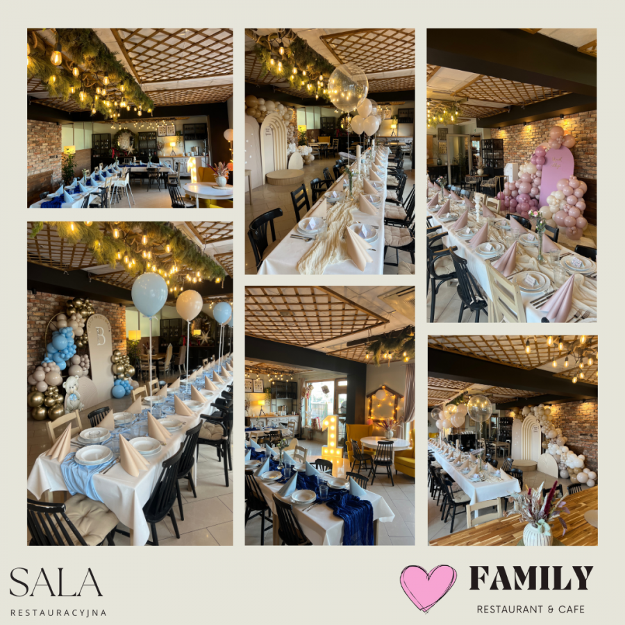 Family Restaurant & Cafe to wymarzone miejsce na organizację imprez okolicznościowych w gronie przyjaciół i znajomych, spotkań biznesowych, konferencji, imprez firmowych oraz spotkań tematycznych. Podczas organizowanych eventów o zabawę dla najmłodszych zadba specjalnie przygotowany zespół animatorów. Dodatkowo, zajęte zabawą dzieci, można oglądać z każdej części lokalu poprzez system monitoringu.