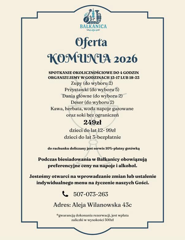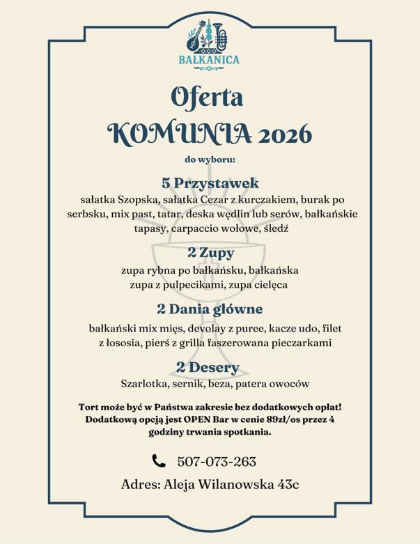 Z radością zapraszamy Państwa do organizacji przyjęć komunijnych, chrzcin, urodzin, rocznic w naszej Karczmie – miejscu, w którym tradycja spotyka się ze smakiem i gościnnością.