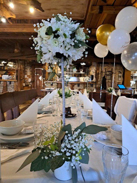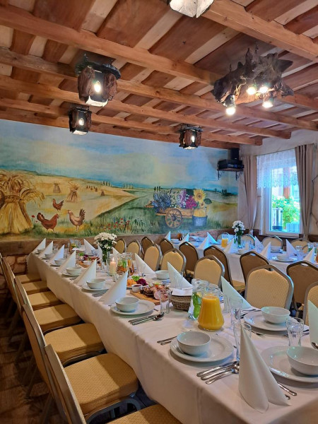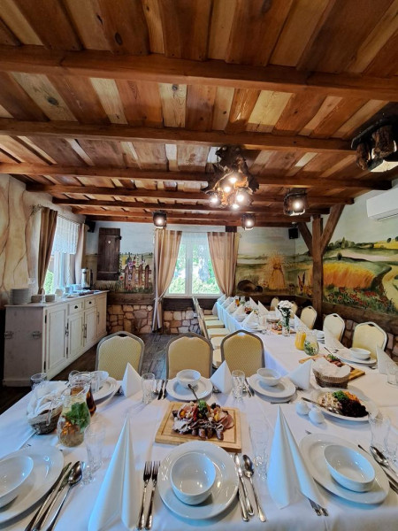 Organizujemy imprezy okolicznościowe: wesel, chrzcin, przyjęć okolicznościowych, spotka firmowych, bankietów, cateringu. Nasza karczma pomieści 190 osób.