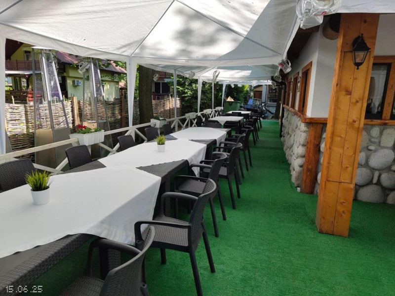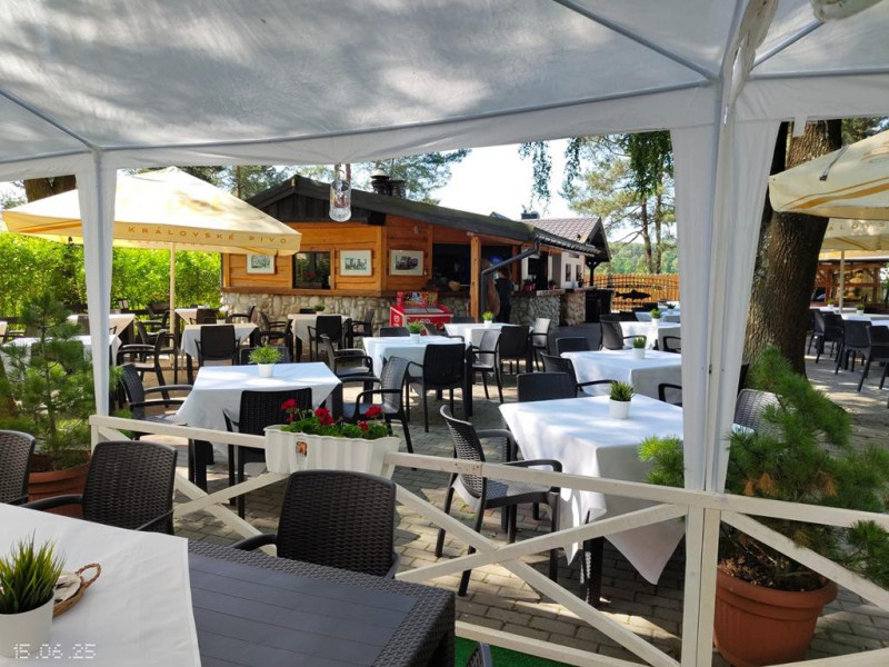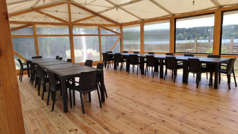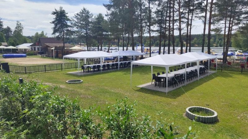 Do dyspozycji gości znajduje się przytulna sala kominkowa, która tworzy ciepły, kameralny klimat, doskonały na rodzinne przyjęcia czy spotkania w gronie najbliższych. Na większe eventy dostępny jest namiot bankietowy z przepięknym widokiem na zalew, zapewniający niepowtarzalną atmosferę podczas wesel, komunii, chrzcin, jubileuszy czy imprez firmowych. Dodatkowo teren uzupełniają stylowe pergole, idealne na letni relaks, garden party lub plenerowe ceremonie.