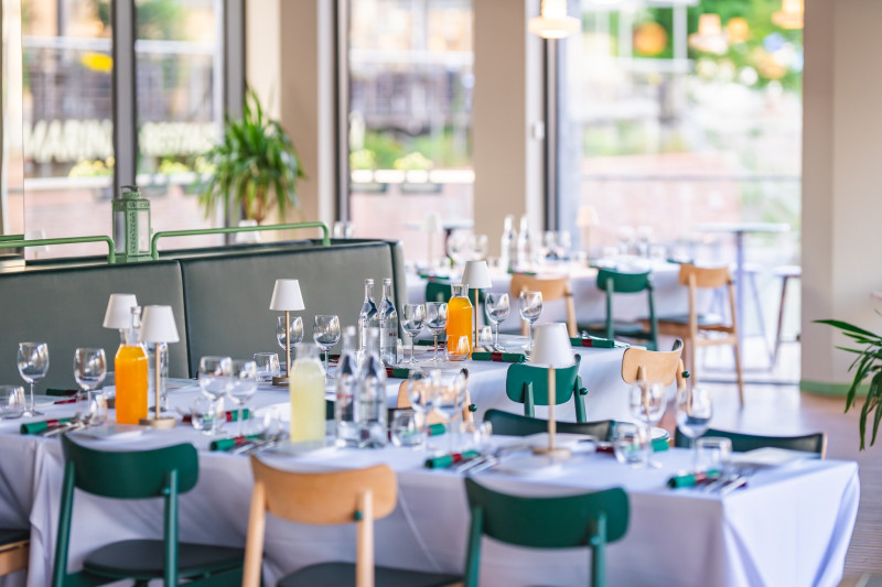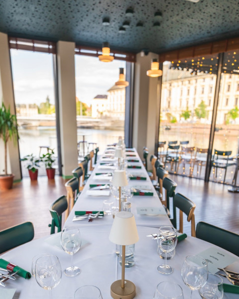 Restauracja może pomieścić ponad 70 osób w sezonie zimowym i blisko 200 osób w sezonie letnim, z imponującym tarasem otoczonym wodą, bezpośrednio przed majestatycznym zabytkowym budynkiem uniwersytetu.
