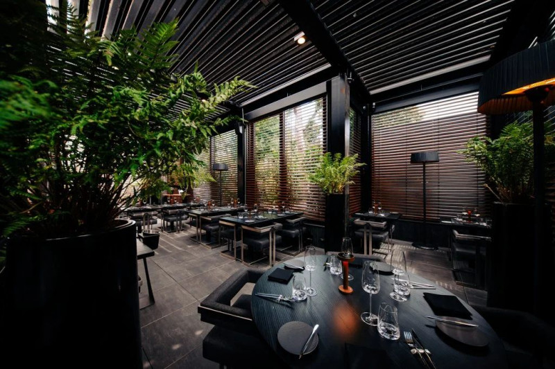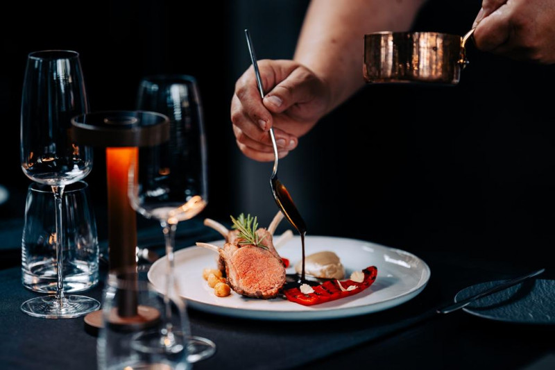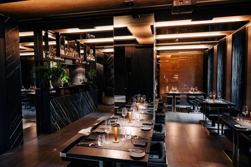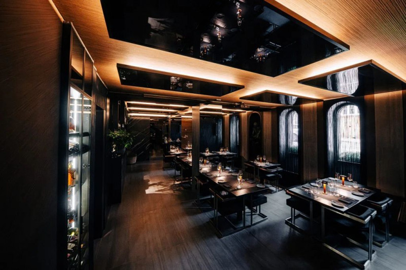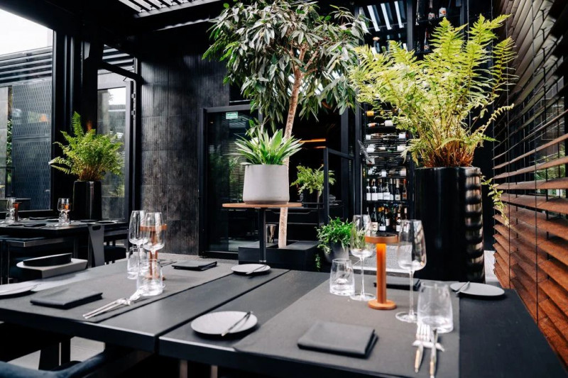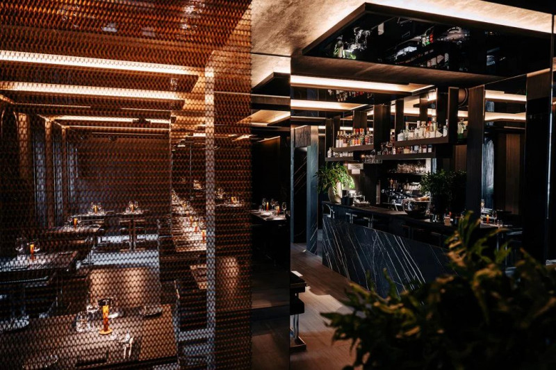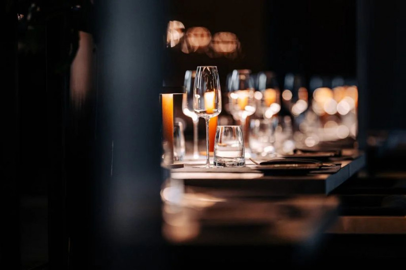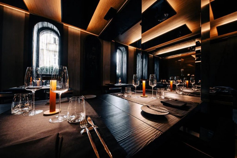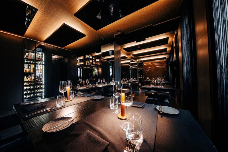 Wnętrze restauracji zachwyca połączeniem minimalistycznego designu z ciepłym oświetleniem i eleganckimi detalami, tworząc idealne tło zarówno na romantyczną kolację, jak i uroczystości rodzinne