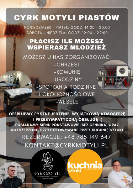 W Cyrku Motyli w Piastowie można zorganizować: chrzest, komunię, urodziny, wesele, spotkania rodzinne, firmowe, okolicznościowe.