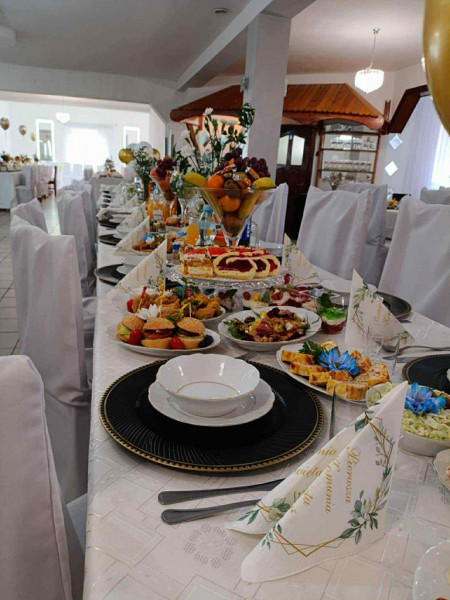 Nasz personel dołoży wszelkich starań, aby uroczystość spełniła oczekiwania najbardziej wymagających gości i pozostała w pamięci na długie lata. Nasz dom otwarty jest dla Tych, którzy oczekują niezapomnianego wesela, chrzcin, komunii, urodzin, jubileuszy, smacznej kuchni i wspaniałej zabawy. Naszym gościom oferujemy smaczne oraz sprawdzone potrawy. Począwszy od lekkich sałatek i przekąsek aż po klasyczną i tradycyjną kuchnie staropolską.