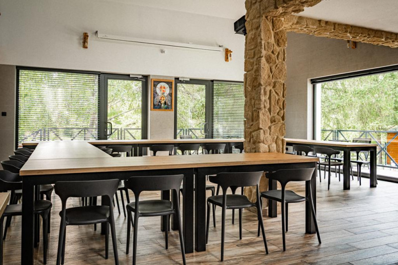 Nasza sala zachwyca dużymi oknami, przez które rozciąga się widok na otaczający las oraz nasze urokliwe oczko wodne. Dzięki temu każdy moment spędzony w tym miejscu otulony jest bliskością natury i spokojem Roztocza.