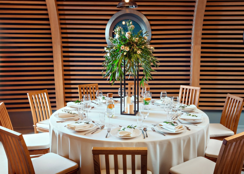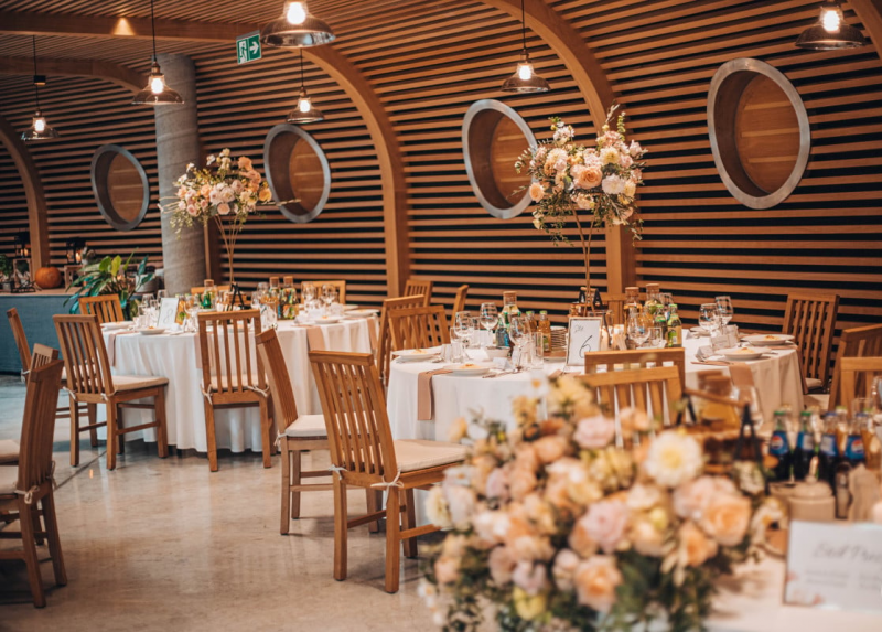 W zależności od wybranych stolików, sala pomieści 140 osób (stoliki prostokątne) lub 120 osób (stoliki okrągłe).