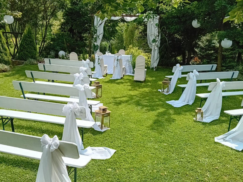 Dodatkowym atutem jest duży, zielony ogród (ok. 2 ha) ze stawami, miejscem na spacer, ognisko i wypoczynek, który stanowi idealne uzupełnienie przyjęcia - szczególnie w sezonie wiosenno-letnim.