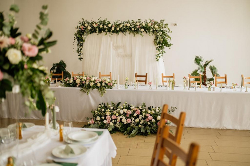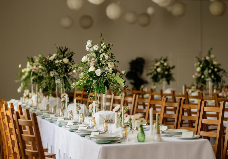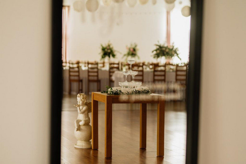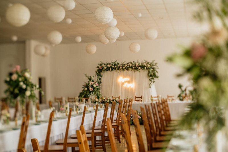 Posiadamy salę, która pomieści 250 osób, wraz z parkietem do tańczenia oraz pokój gościnny dla Pary Młodej.