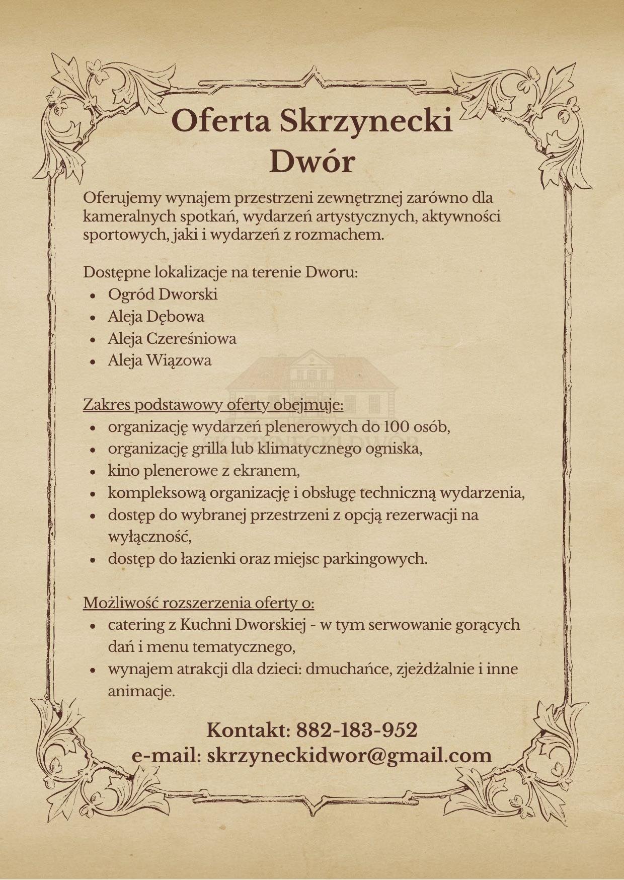 Do dyspozycji gości są malownicze przestrzenie plenerowe – Ogród Dworski, Aleja Dębowa, Aleja Czereśniowa i Aleja Wiązowa – które tworzą niepowtarzalny klimat uroczystości. Obiekt zapewnia kompleksową organizację wydarzeń do 100 osób, dostęp do zaplecza technicznego, łazienek oraz miejsc parkingowych.