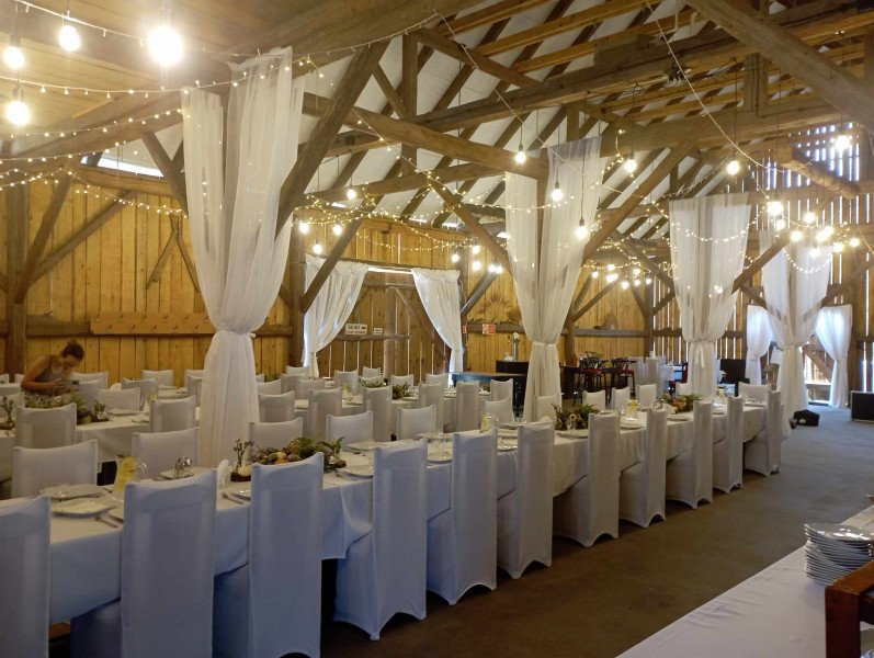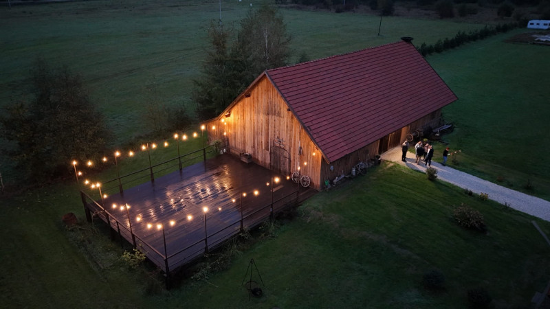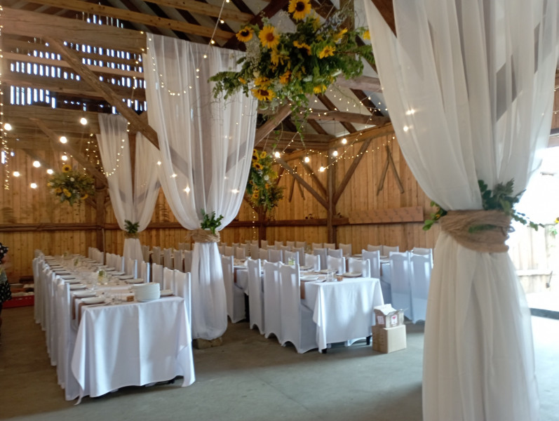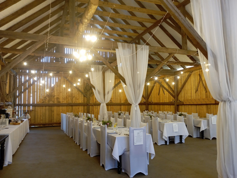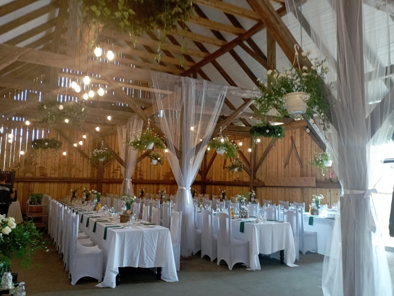 Stodoła jest w pełni wyposażona w stoły i krzesła, klimatyzowana, z tradycyjnymi toaletami z bieżącą wodą dostępnymi bezpośrednio z sali. Na miejscu można zorganizować zarówno przyjęcie, jak i samą ceremonię zaślubin w plenerze, co pozwala stworzyć spójną, romantyczną oprawę bez konieczności przemieszczania się gości. Bliska odległość od obiektów noclegowych ułatwia logistykę i sprawia, że para młoda nie musi martwić się o powroty weselników.