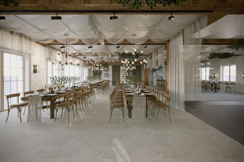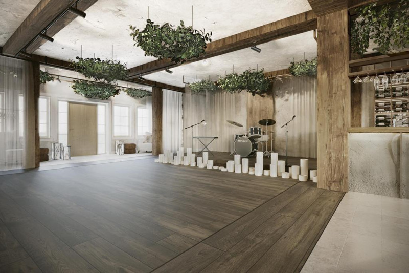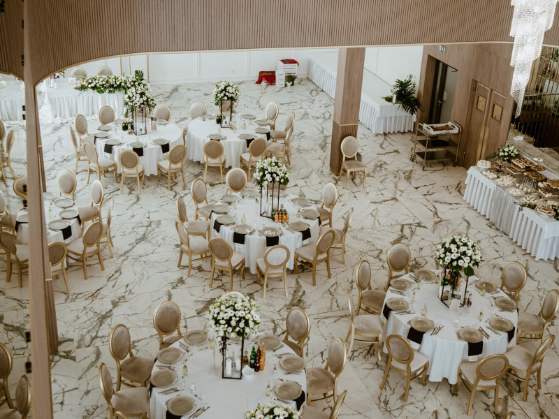Z antresoli, goście będą mieli piękny widok na część taneczną. Sala jest wyposażona w okrągłe stoły.